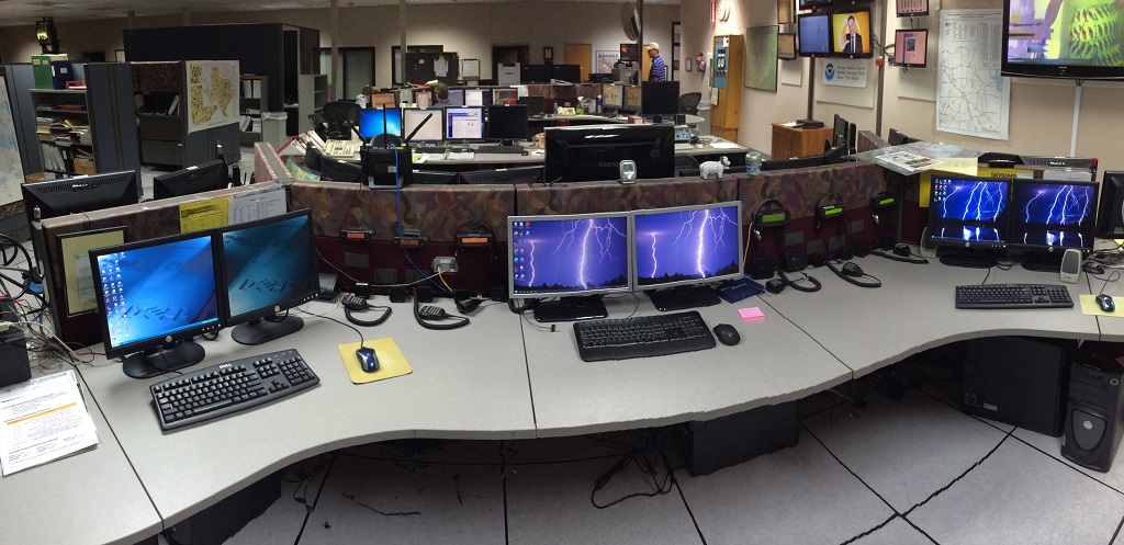 Announcing the new SKYWARN radio desk for the Fort Worth National Weather Service office. Equipment, time and sweat donated by the WX5FWD SKYWARN volunteer team. Most radios were moved under the raised floor, with control heads mounted on the desk wall. The old radio shelf has been removed, providing additional desk space. Three desktop computers with dual monitors have been installed with Windows 7, replacing two old Windows XP computers, to monitor nwschat, radar, video feeds and alerts. In case this is your first view of the desk, the NWS warning forecasters sit on the other side of the desk wall facing the radio operators.
